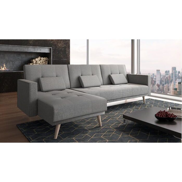Canapé d´angle convertible avec fonction couchage (convertible) lit 160x187cmSiège rembourré Canapé convertible en lit d’appoint en inclinant les dossiers comme un clic-clac Méridienne modulable à droite ou à gauche Description technique :Revêtement en tissu gris. Structure en bois massif et panneaux de particules Assises et dossiers rembourrés en mousse de 50 kg/m3 Dimensions hors tout :Total : L 267 x P 137 x H 88 cm Lit : L 160×187 cm Emballage :Colis 1 : 165 x 114 x 27 cm 48 Kg Colis 2 : 163 x 84 x 27 cm 30 Kg