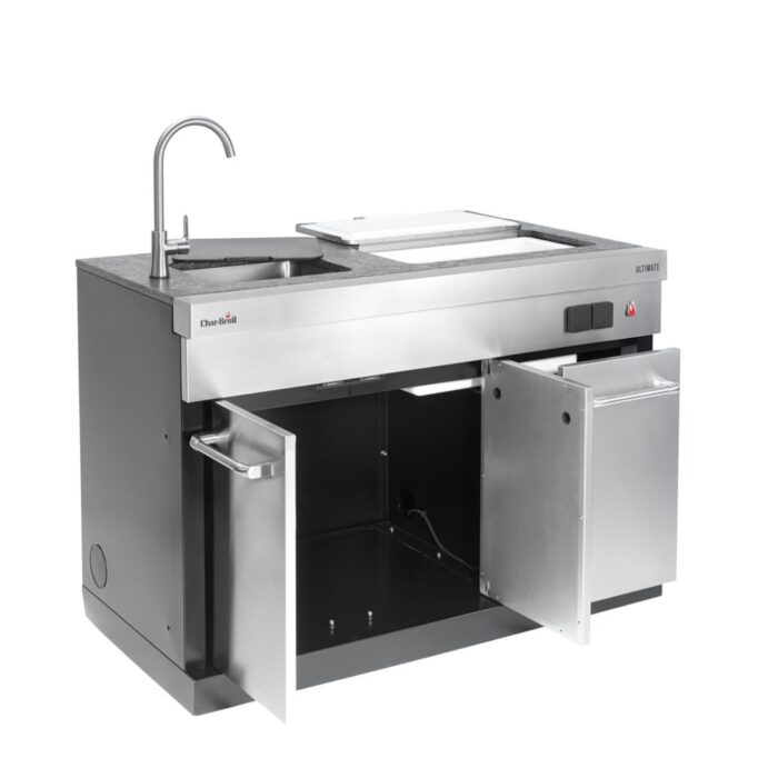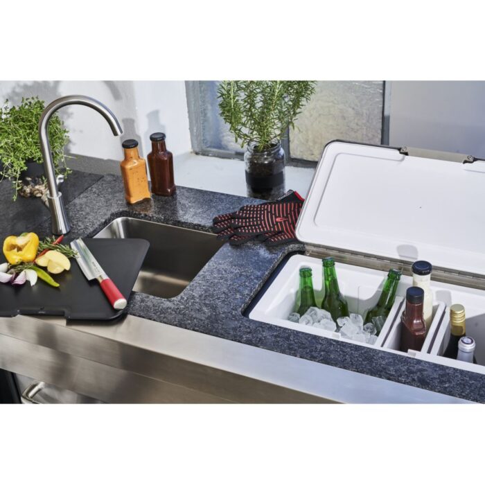 La partie Ultimate Entertainment a été conçue en acier inoxydable de haute qualité. Le plan de travail est en granit gris à la fois design et résistant. Elle est équipée d’un lavabo, d’une planche à découper en plastique, une glacière, un bac à déchets amovible et d’une double prise intégrée. Tous ces modules se combinent parfaitement à l’Ultimate Outdoor. N’hésitez pas à visualiser la vidéo qui vous donnera un aperçu du meuble.