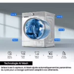 - AI Wash : augmente les performances de lavage et optimise la consommation d’eau et de lessive. Il détecte le poids et le type de linge et son niveau de salissure puis optimise les paramètres de lavage grâce à un distributeur automatique de lessive intelligent.