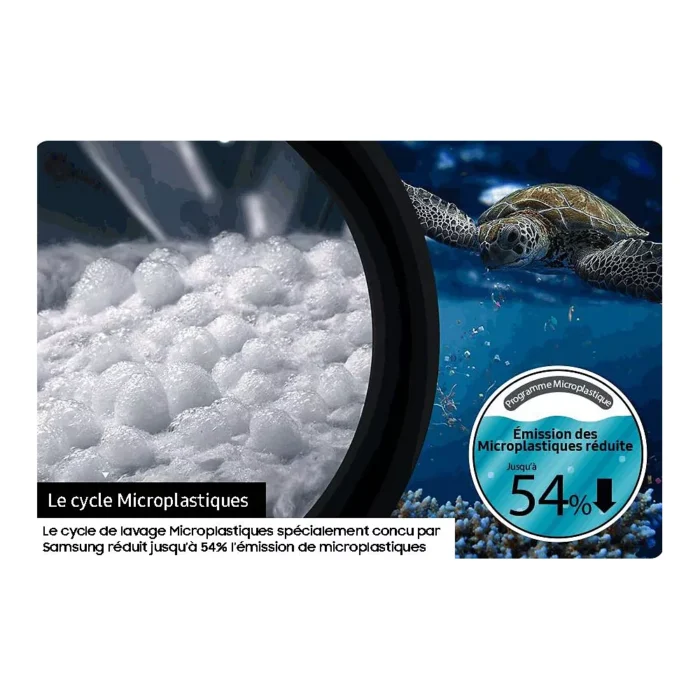 Le lave-linge Samsung WW11DB7B94GE est doté d’un programme microplastiques pour en réduire les émissions. Le programme utilise la technologie ecobubble pour ne pas trop chauffer, ni trop brasser le linge. Résultat : une réduction de 54% d’émission de microplastiques lors du lavage.