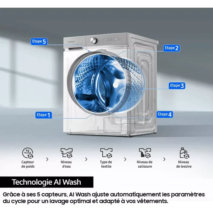- AI Wash : augmente les performances de lavage et optimise la consommation d’eau et de lessive. Il détecte le poids et le type de linge et son niveau de salissure puis optimise les paramètres de lavage grâce à un distributeur automatique de lessive intelligent.