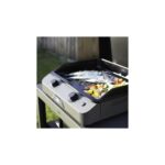 Plancha gaz 2 feux en fonte émaillée pour 6 à 8 personnes, encastrée dans un chariot qui comporte 2 tablettes rabattables et qui est fermé par 2 rideaux noirs pour cacher la bouteille de gaz. 2 grosses roues permettent de déplacer facilement l’ensemble.Ensemble très compact chariot et plancha gaz pour s’intégrer très facilement dans un jardin ou une terrasse. Cet ensemble de couleur gris cargo convient pour les amateurs d’une cuisine saine et conviviale avec du matériel très performant. La plancha s’intègre parfaitement sur le chariot dont les tablettes sont rabattables pour un rangement optimal. Etagère de rangement épices et accroche ustensiles.