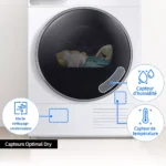 - Optimal Dry : l’arrêt du séchage est automatique grâce au capteur d’humidité, ce qui permet des économies d’énergies et un plus grand soin du linge.