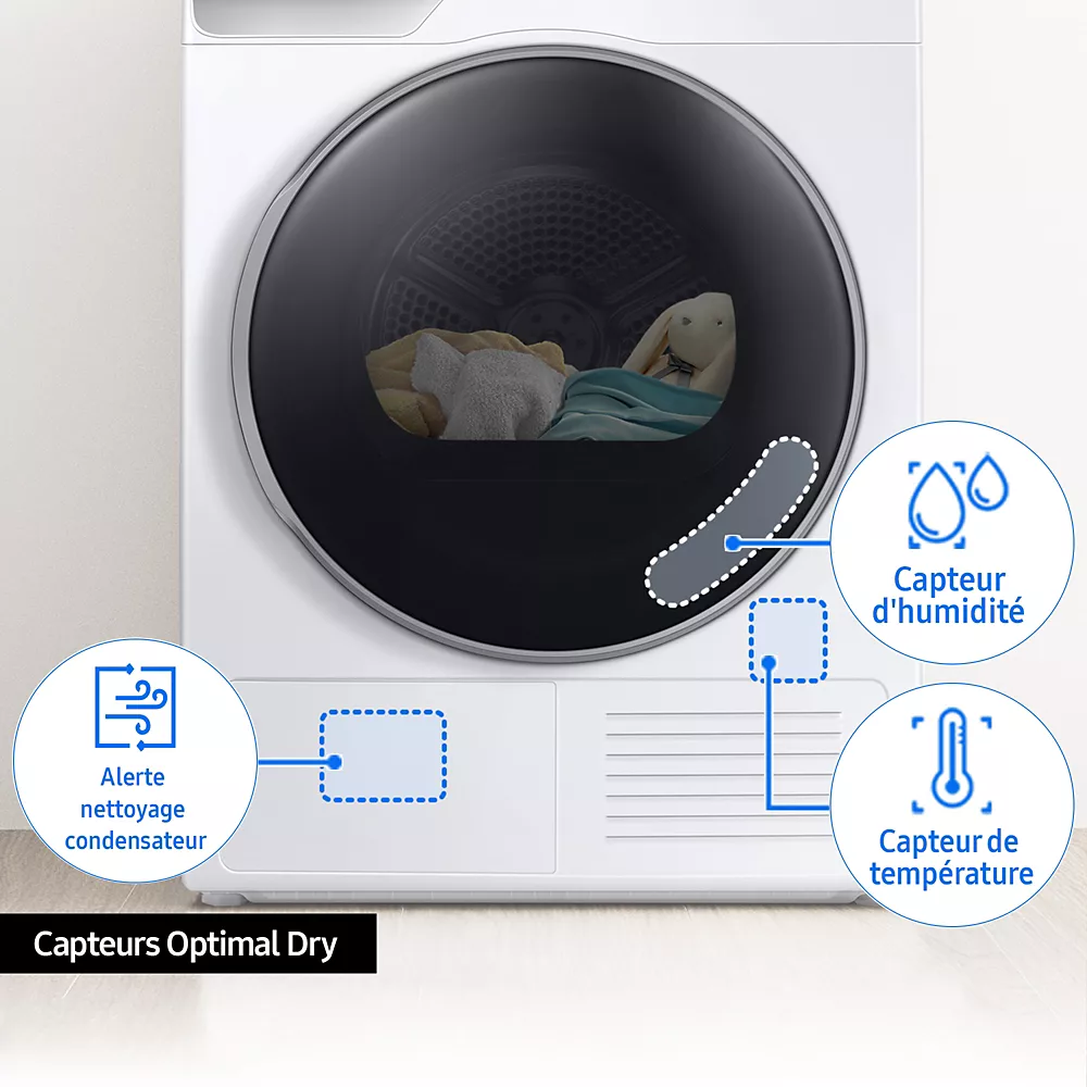 - Optimal Dry : l’arrêt du séchage est automatique grâce au capteur d’humidité, ce qui permet des économies d’énergies et un plus grand soin du linge.