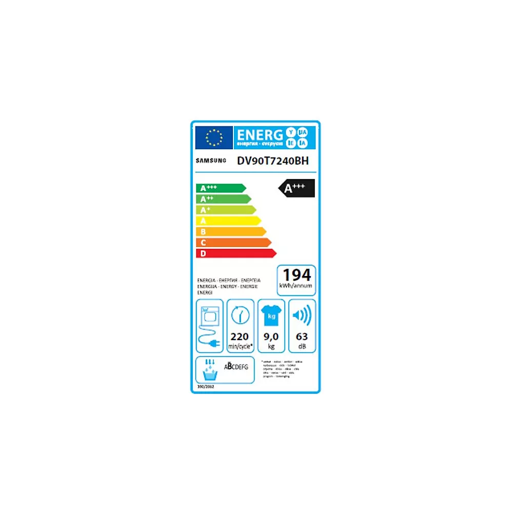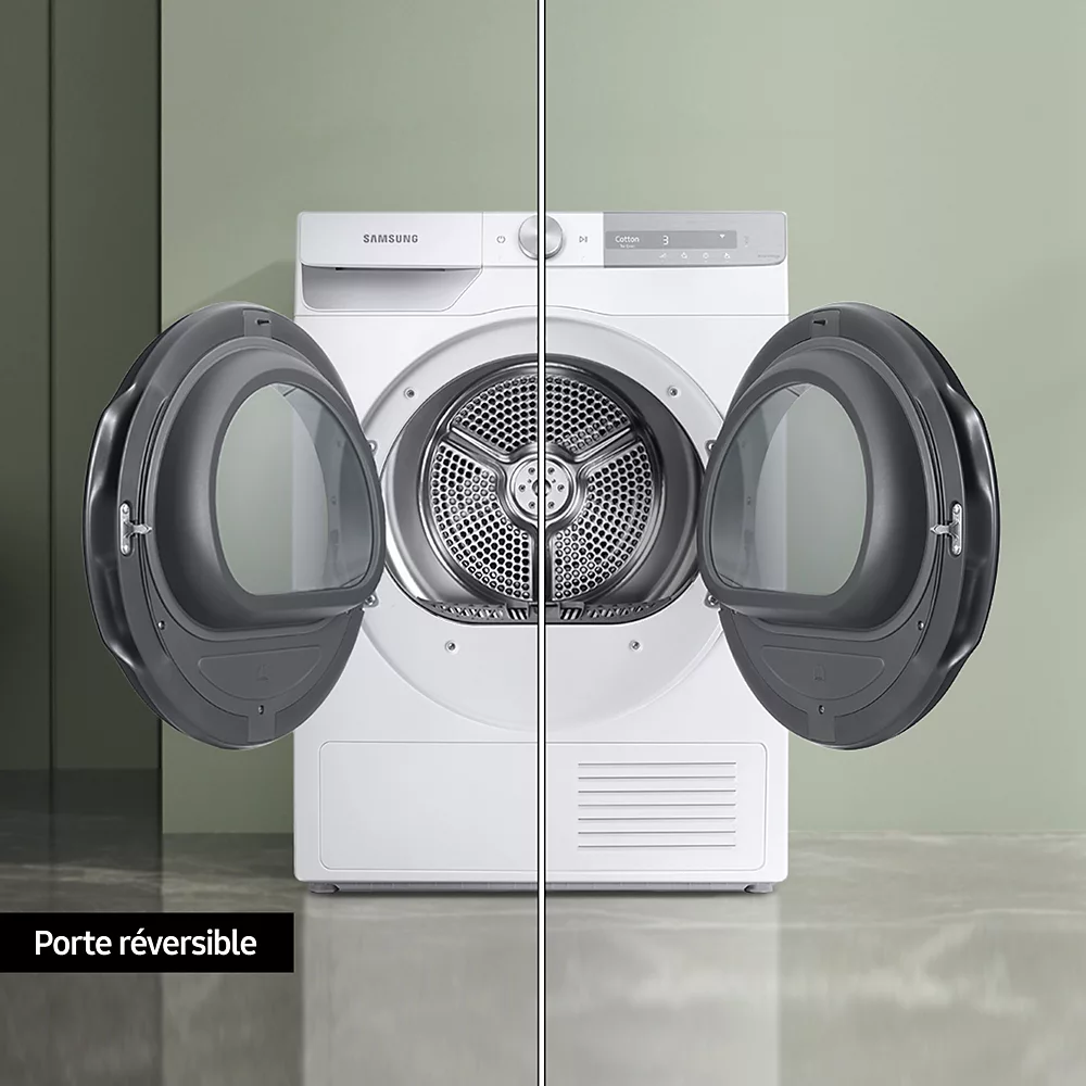 Équipé d’un système de pompe à chaleur, le sèche-linge SAMSUNG DV90T7240BH recycle l’air chaud et optimise la température à l’intérieur du tambour, ce qui permet de mieux respecter les fibres textiles. Avec son efficacité énergétique A+++, vous économiserez de l’énergie.