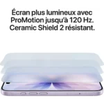 - Le + : Écran plus lumineux avec ProMotion jusqu’à 120 Hz. Résistance aux rayures 3x supérieure grâce au Ceramic Shield 2.